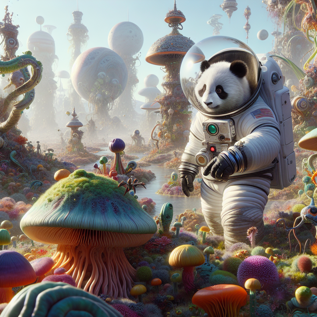 Picture a panda astronaut exploring an alien planet, encountering strange creatures, bizarre landscapes, and uncovering hidden mysteries.