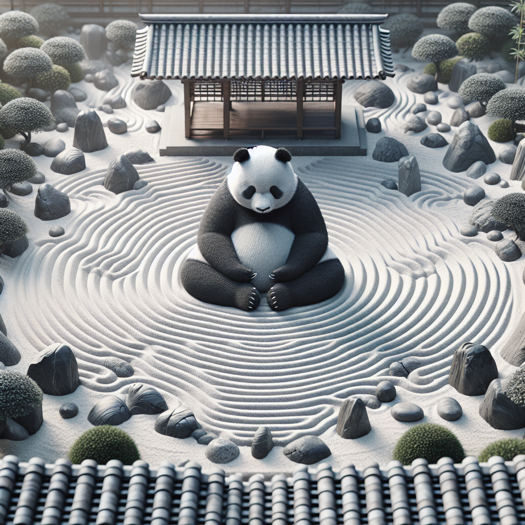Imagine a peaceful scene where a panda meditates in a beautifully crafted Zen garden, surrounded by carefully arranged stones, raked sand, and trickling water features.