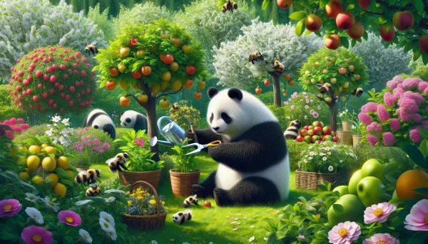 A diligent panda tending to a lush, colorful garden filled with blooming flowers, fruit trees, and buzzing bees. The panda is seen watering plants, trimming bushes, and enjoying the beauty of nature in full bloom.