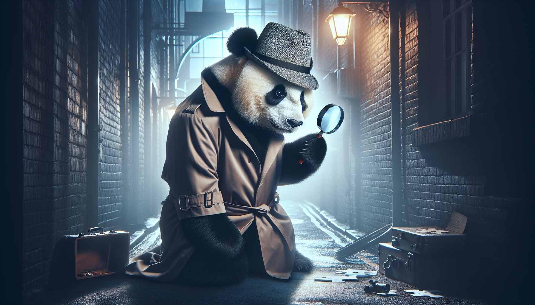 A clever panda dressed as a detective, complete with a trench coat, magnifying glass, and fedora, investigating a mysterious case. The scene is set in a foggy, dimly lit alleyway, filled with clues and intrigue, reminiscent of a classic noir film.