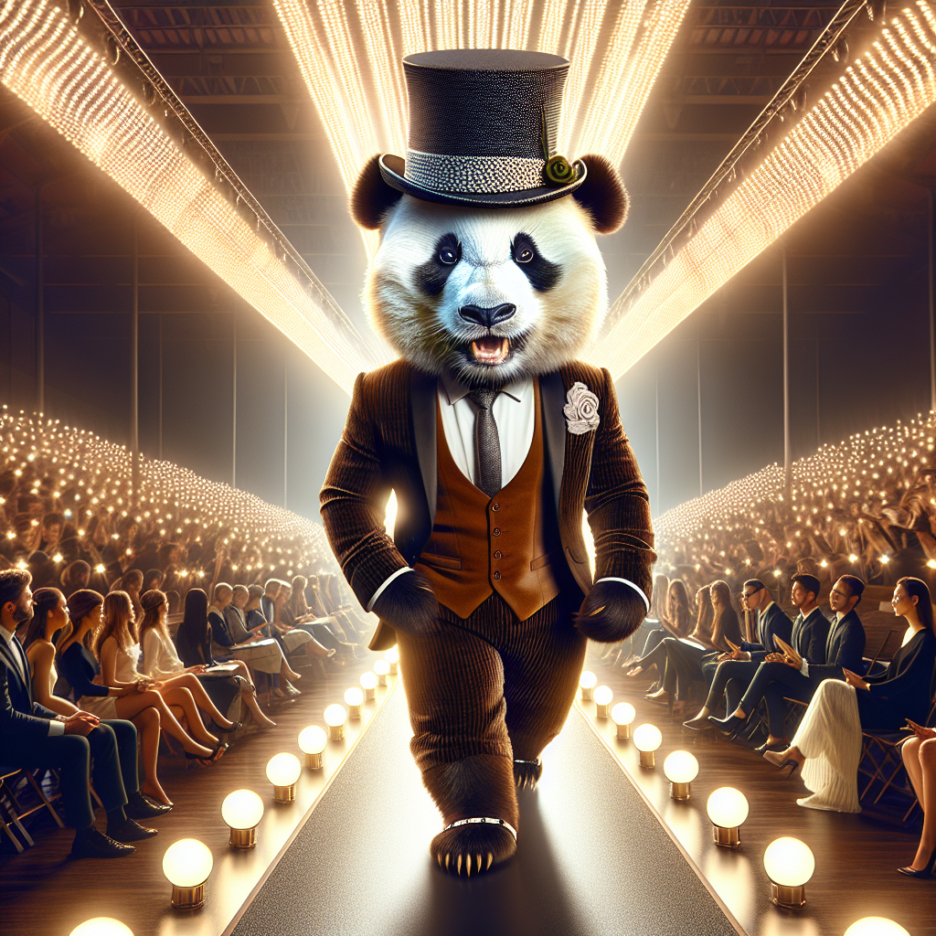 A stylish panda strutting down a high-fashion runway, dressed in an avant-garde outfit. The scene is filled with flashing lights, a glamorous audience, and bold fashion designs, showcasing the panda's sense of style and confidence.